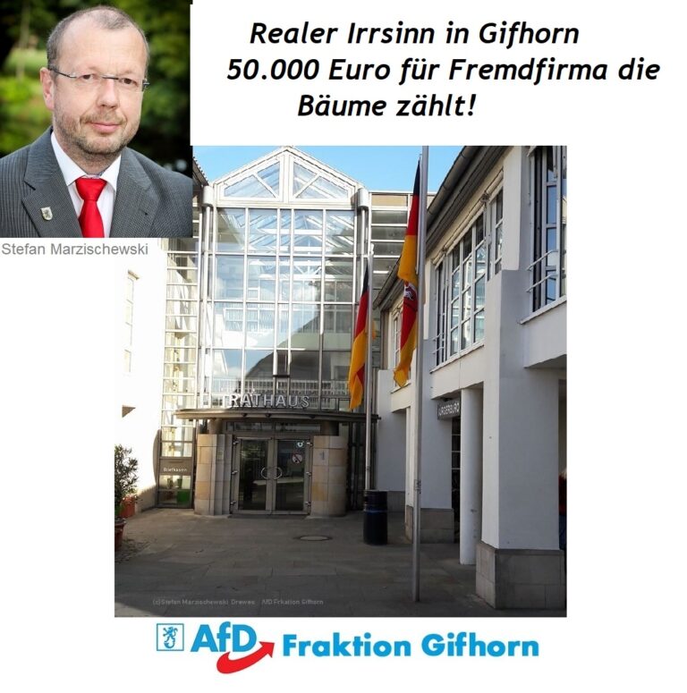 In der letzten Ratssitzung wurde des Haushaltsplan 2026 mit einer Rekordneuverschuldung von 33 Millionen Euro von SPD, CDU und FDP durchgewunken. Die Stadt Gifhorn leistet sich dabei für 50.000 Euro eine Fremdfirma, die Bäume im Stadtgebiet zählt und beschäftigt darüber hinaus selbst 1,5 Mitarbeiter zur Kontrolle der Bäume: Dazu der